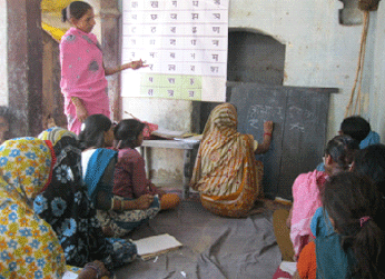 फोटो परिचय - पाठशाला में बालिकाओं एवं महिलाओं को शिक्षण प्रदान करते हुए शिक्षिका।
