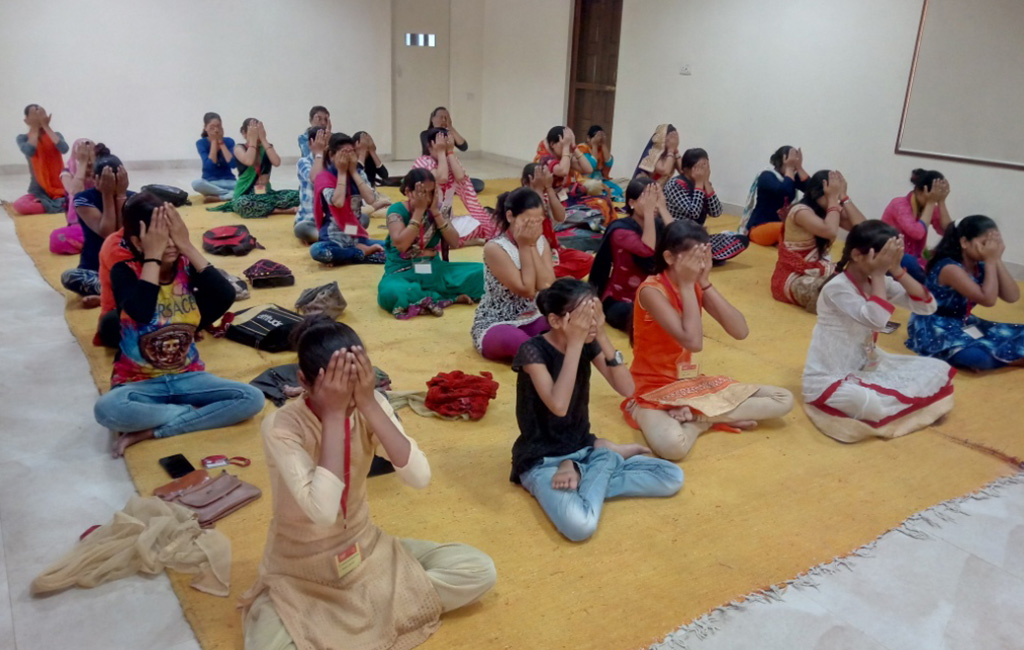 योग क्रिया करती बालिकाएं।
