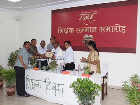 शब्दम् संस्था द्वारा इस वर्ष भी देश को भावी पीढ़ी के निर्माता शिक्षक का सम्मान किया गया। इस श्रृंखला में इस प्राइमरी एवं इण्टर स्तर के तीन शिक्षकों क्रमशः वीरेन्द्र सिंह चैहान, शिक्षक प्राथमिक विद्यालय नगला टपुआ, तहसील सिढपुरा, कासगंज, डा. राजेन्द्र कुमार तिवारी सेवानिवृत्त प्राचार्य पार्वती राष्ट्रीय इण्टर कालेज सिढ़पुरा, कासगंज एवं सुश्री रेखा शर्मा उपप्रधानाचार्य ज्ञानदीप विद्यालय शिकोहाबाद को शॉल, नारियल एवं सम्मान पत्र देकर सम्मानित किया गया। साथ ही कार्यक्रम की अध्यक्षता कर रहे डा. आर.के. सिंह जी को भी शॉल पहनाकर स्वागत किया गया।