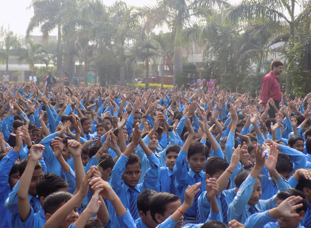 हिन्दुस्तानी शास्त्रीय संगीत एवं कार्यशाला का अभिवादन करते स्कूली छात्र।