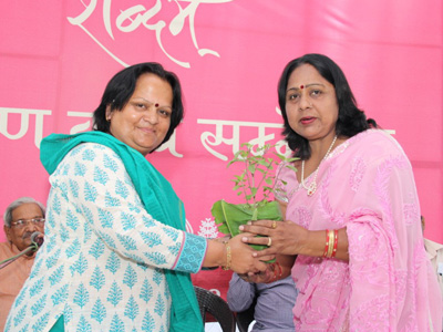 कवियत्री श्रीमती चेतना शर्मा का हरित कलश देकर स्वागत करतीं शब्दम् सलाहकार डा. रजनी यादव