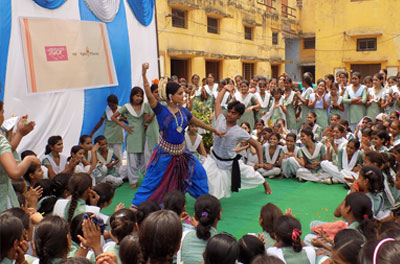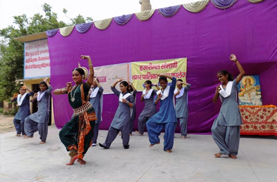 नृत्य कार्यशाला में नृत्यागंना के साथ ताल से ताल मिलाती छात्राएँ।